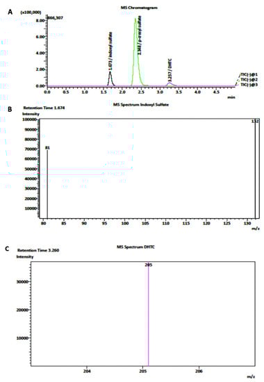 - Ahmed, S.; Sparidans, R.W.; Lu, J.; Mihaila, S.M.; Gerritsen, K.G.F.; Masereeuw, R. A Robust, Accurate, Sensitive LC–MS/MS Method to Measure Indoxyl Sulfate, Validated for Plasma and Kidney Cells. Biomed. Chromatogr. 2022, 36, e5307. [Google Scholar] [CrossRef]