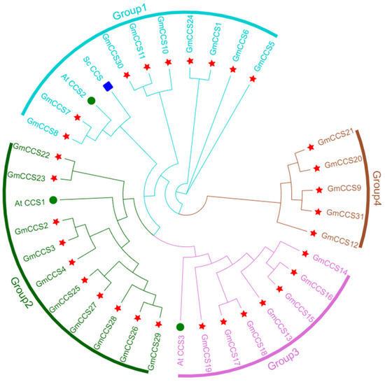 Phylogenetic tree of CCS proteins in Glycine (G.) max, Arabidopsis thaliana and Saccharomyces cerevisiae. Four subgroups were classified with different colors, and their names are marked in the corresponding positions. The circle, five-pointed star, and square text indicate Arabidopsis thaliana, Glycine (G.) max and Saccharomyces cerevisiae, respectively.