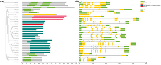 Genome sequence and annotation files of AtCCSs, ScCCS and GmCCSs were downloaded and queried by TBtools. The exon-intron organization of 31 GmCCS genes was examined to obtain information on the structure, diversity, and evolution of GmCCS families in soybean, and the number of exons in GmCCS family members were from 3–7 (Figure 3B). Closely related genes have similar exon-intron arrangements with similar protein structures.
