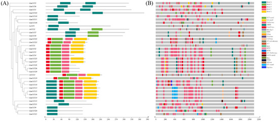 (A) The motifs in GmCCSs’ protein. Boxes 1–5 represent motifs 1–5, the grey line indicate the non-specific functional area. (B) Visualization of hormone-responsive elements in GmCCSs promoters by TBtools, including position, kind and quantity of elements.