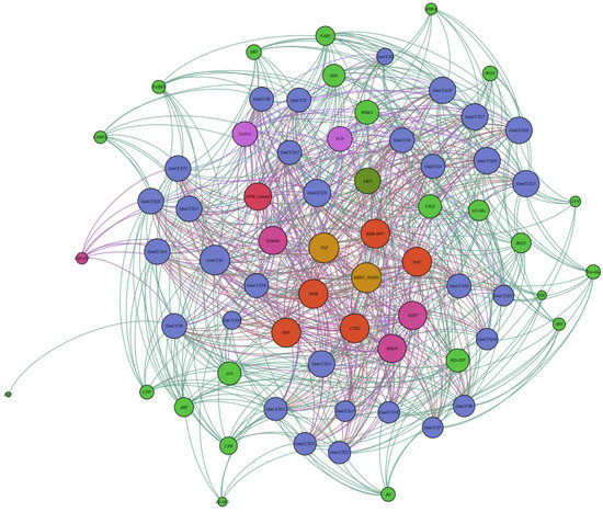 Interacting network among GmCCS family and their potential predicted TFs/protein. The blue cycle represents the GmCCSs gene, the circles with different colors represent different TFs, the lines indicate the relationship between different TFs.