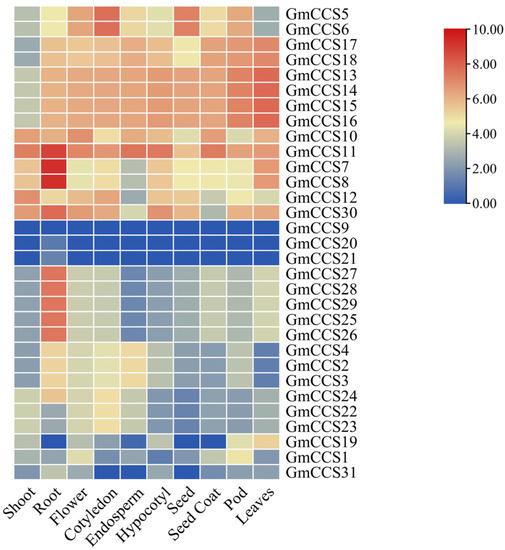 Heat map of expression profiles (in log2-based FPKM) of soybean GmCCS subgroup genes in different tissues (root, root hairs, stem, leaf, nodules, flower and seed). The gene names are on the left and the tissue names are on the top of the figure, and the expression abundance of each transcript is represented by the color bar: Red, higher expression; blue, lower expression.