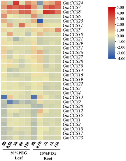 RT-qPCR analysis of GmCCS genes under drought stress. The heatmap was created based on the RT-qPCR results. The transcript abundance is represented by the color bar.