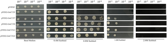 The coding sequence of GmCCSs was PCR amplified using cDNA from Williams 82 leaves with the primer pair listed in Supplemental Table S3. The PCR products were then inserted in the pYES2 vector. The resulting construct was then introduced into yeast strain INVSc1. Stress tolerance test in yeast was performed according to Gautam [30]. Yeast cells containing the vectors pYES2 (control) or pYES2-GmCCSs were grown in SC-URA (without uracil) medium with shaking (200 rpm) at 28 °C for 24 h, and their OD600 was adjusted with SC-URA to 1, 0.1, 0.01, 0.001, respectively. For the salt stress test, one microliter of each diluted culture was spotted onto SC-URA medium supplemented with 0.8, 1.0, 1.1, 1.3 M NaCl; For the osmotic stress test, the yeast cells were cultured in 0.4, 0.8, 1.6, 2.0 M sorbitol. For the alkali stress test, the yeast cells were cultured on SC-URA medium supplemented with 0.2, 0.4, 0.6, 0.8 M NaHCO3 at 28 °C. Transgenic yeast harboring empty vector pYES2 was used as the control. The experiments were repeated three times.