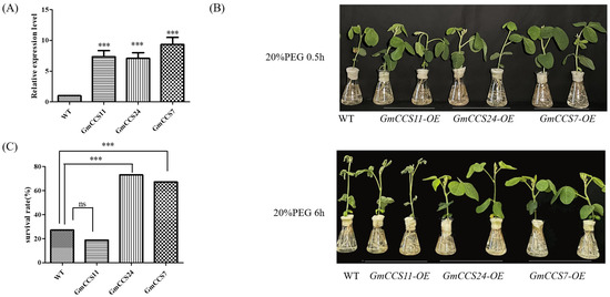Accordingly, we overexpressed three GmCCSs under the control of the CaMV 35S promoter in the soybean hair roots. Compared to control hairy roots, transgenic roots had a significant increase of GmCCS7, GmCCS11 and GmCCS24 expression, respectively (Figure 9A). Soybean seeding plants with GmCCS7-OE and GmCCS24-OE hair roots performed better than the control, however GmCCS11-OE did not (Figure 9B). Survival rates (%) were calculated after drought stress treatment. As shown in Figure 9C, survival rates were 67.3% and 73.2% for soybean seeding plants with GmCCS7-OE and GmCCS24-OE root, 13.9% for seeding plants with GmCCS11-OE, and 27.3% for control plants. The survival rates of soybean seeding plants with GmCCS7-OE and GmCCS24-OE root were significantly higher than the control plants, however, survival rates of soybean seeding plants with GmCCS11-OE root were not. These results indicated that GmCCS7 and GmCCS24 improve drought stress tolerance in soybean, but GmCCS11 does not.