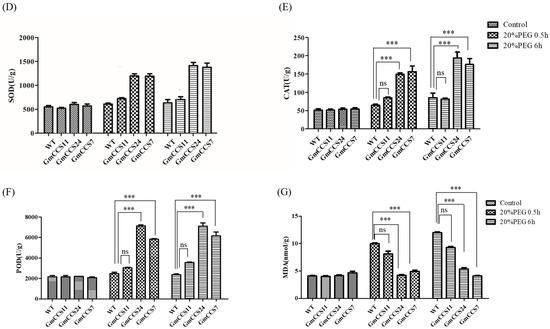 To explore the mechanism of GmCCS7, GmCCS11 and GmCCS24 in drought stress tolerance, the activities of antioxidant enzymes (SOD, CAT, POD) were examined. As shown in Figure 9D–F, the SOD, CAT, and POD activities of three GmCCS-OE transgenic soybean roots showed no differences compared with control plants without drought treatment. Under drought stress conditions, the activities of these three enzymes in GmCCS7-OE and GmCCS24-OE transgenic soybean roots were significantly higher than those in control plants. The activities of CAT in GmCCS11-OE transgenic soybean roots were higher than those in control soybean roots, however, the activities of SOD and POD in GmCCS11-OE transgenic soybean roots were comparable to the control plants. GmCCS11 could enhance the activities of antioxidant enzymes CAT, but not SOD and POD, raising the possibility of why GmCCS11 did not improve drought stress tolerance in soybean. MDA content which represents the degree of cell membrane damage was assessed, as shown in Figure 9G, MDA contents of GmCCS7-OE and GmCCS24-OE transgenic soybean roots were lower than the control plants. Thus, the degree of damage to the cell membrane damage of GmCCS7-OE and GmCCS24-OE transgenic soybean roots was lower than the control. These results indicated that GmCCS7 and GmCCS24 enhanced drought stress tolerance by elevating the activities of antioxidant enzymes and decreasing cell membrane damage.
