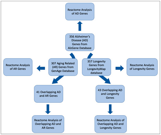 We used three sets of genes for our study: human Alzheimer’s disease (AD) genes, aging-related (AR) genes, and longevity genes. With these three gene sets, two additional gene sets were created by: (1) identifying the genes shared both by the AD genes and by the AR genes (AD–AR Overlap) and (2) identifying the genes shared both by AD genes and longevity genes (AD–longevity overlap). Firstly, we utilized the AlzGene database (www.alzgene.org; last accessed 10 May 2021) to extract a list of 680 identified human AD genes from GWAS and previous linkage studies [16,102]. Each gene from the database was linked to a number of positive or negative test results from each GWAS study, which were then used to validate the reliability of the data. Out of the 680 genes, 356 genes had positive results (AD genes), and 324 genes had negative results. Since the definite negative and positive results were not included in the database, we used the p-value from previous studies for each gene. If p < 0.05, we assumed the data was reliable and counted them as a positive result; studies with p > 0.05 were regarded as negative and were not included in our study. Note that we used a more stringent threshold of p < 1.0 × 10−5 to validate the Reactome pathways (see text). Research outcomes listed as trends or inconclusive were also not included in our study. Secondly, we utilized the GenAge database (www.genomics.senescence.info; last accessed 10 May 2021), a benchmark database of 307 genes possibly related to human aging (AR). The genes were extensively reviewed for inclusion based on findings in the model organisms put in the context of human biology, plus genes directly related to aging in humans [103]. Thirdly, we utilized the LongevityMap database (www.genomics.senescence.info/longevity/; last accessed 12 December 2021), a database of 751 genes associated with human longevity [20]. In the database, 394 genes were labeled “non-significant” and thus excluded from this study for analysis. The remaining 357 genes were labeled as “significant” (Longevity genes) and used in this study. Finally, the list of AD Genes was used to cross-reference the presence of any genes shared by the combinations of each gene set (AD–AR overlap genes and AD–longevity overlap genes). When comparing AD genes with AR genes, 41 overlapping (AD–AR overlap) genes were found. When comparing AD genes and Longevity genes, 43 overlapping (AD–longevity overlap) genes were found.