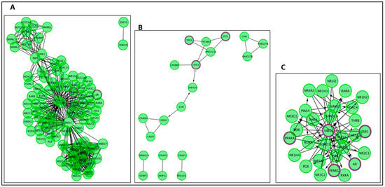 The Reactome pathways from Figure 2 converted into a functional interaction network. Sub-pathways within the original pathway diagrams were extracted into the FI network as well. Hit genes are displayed in a thick purple border in the FI network view for a hit pathway. (A) Generic transcription pathway. (B) TP53 regulates the transcription of death receptors and ligands. (C) SUMOylation of intracellular receptors.