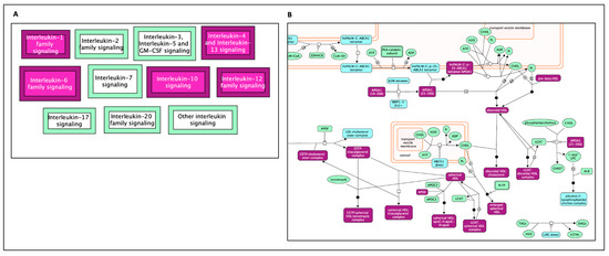 The top result from the enriched pathway analysis is “Interleukin-4 and Interleukin-13 signaling” (FDR = 2.32 × 10−5; p = 7.64 × 10−8), which is a sub-pathway of “signaling by Interleukins” (FDR 4.57 × 10−4; p = 1.20 × 10−5) and part of the “Immune System” general pathway. Out of the 112 proteins found to be involved in the “Interleukin-4 and Interleukin-13 signaling” pathways, 7 were shared by AD–longevity overlap genes. Key hit genes involved with these pathways include TNF, IL10, IL18, and IL6. These genes are also shown to be involved in Interleukin 10 signaling. Interleukin pathways are shown in Figure 4A and Figure 5A.