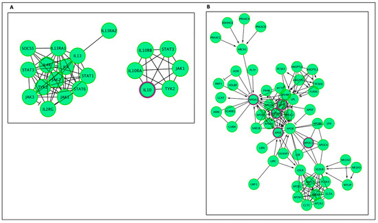 The Reactome pathways from Figure 4 converted into a functional interaction network. Hit genes are displayed with a purple border. (A) FI network for the diagram of Interleukin-4, Interleukin-13, and Interleukin-10 signaling, (B) FI network for the diagram of plasma lipoprotein assembly, remodeling, and clearance.