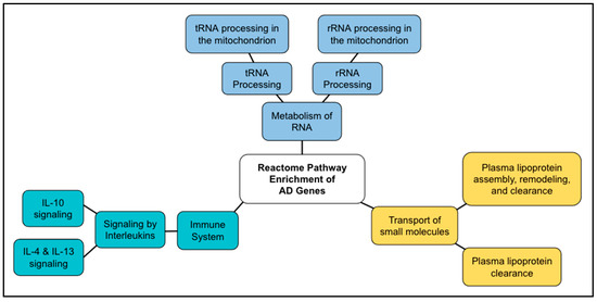 The AD genes are associated with the health risk of AD, which were identified previously [7,8]. The top pathways (Table 1) were grouped into three categories: mitochondrial RNA metabolism (processing of RNA), lipoprotein metabolism (lipid metabolism), and interleukin signaling (immune system) (Figure 7). The pathway of “Mitochondrial RNA metabolism” was unique to the pathways identified by AD genes, while the other two categories, lipoprotein metabolism (lipid metabolism) and interleukin signaling (immune system), also overlapped with the pathways identified by Longevity genes. We discuss mitochondrial RNA here, and the others are discussed below in Section 3.4.