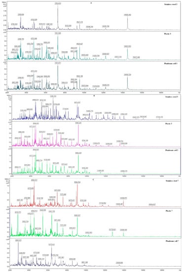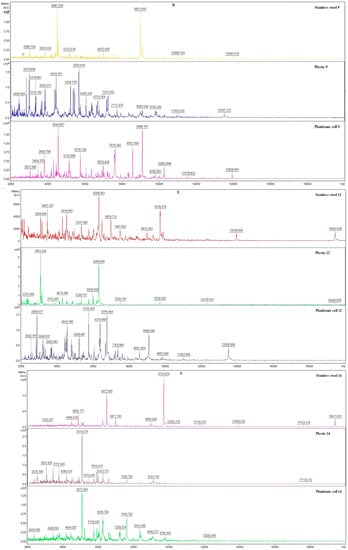 Owing to the addition of SSEO to the experimental group, changes in the mass spectra of both surfaces were recorded already on the 3rd day of the experiment (Figure 1A). In the case of the mass spectra obtained from the antibody surface of the experimental group, there was a decrease in the number of mass spectra peaks compared to the control planktonic spectra. On the contrary, in the experimental spectra obtained from the plastic surface, there was an increase in the number of detected peaks compared to the control planktonic spectrum. These results indicate no significant inhibition of the P. fluorescens biofilm-forming bacteria after the 3rd day of treatment with SSEO. However, results obtained on the 5th day of the experiment (Figure 1B) display an increase in the detected peaks in the mass spectra of the experimental groups compared to the control planktonic spectrum on the same day of the experiment. On the 7th day of the experiment (Figure 1C), a visible change in the experimental mass spectra compared to the control was observed. Based on these observations, we conclude that SSEO clearly initiated the inhibition of P. fluorescens biofilm. This trend continued until the end of the experiment (days from 9th to 14th), which can be seen in Figure 1D–F. Moreover, the most significant differences were observed on the last day of the experiment.