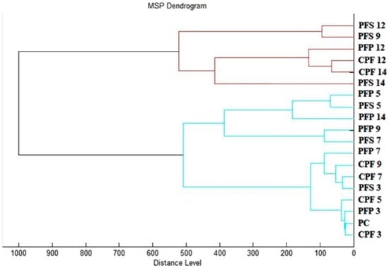 A dendrogram constructed according to the mass spectra is presented in Figure 2. Based on the MSP distances, the constructed dendrogram reflected the similarities in the biofilm structure of the control and experimental groups. It can be observed from the dendrogram that the shortest MSP distances were reached by the early biofilm stages of the experimental groups, during days 3 and 5 (PFS 3; 5 and PFP 3; 5) together with the control groups (CPF 3-14). As the time of exposure of the experimental groups to SSEO increased, their MSP distance increased compared to the control groups. The most significant difference occurred on the 14th day of the experiment, when the MSP distances of the experimental groups were the largest, with the predominance of the experimental group on the stainless-steel surface (PFS 14). From this observation, we concluded that SSEO affects the homeostasis of the P. fluorescens biofilm, thereby helping to inhibit it. These findings are consistent with mass spectral analysis.