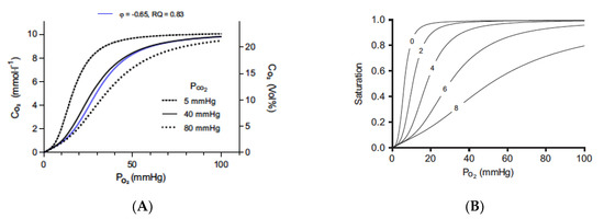 The Bohr effect, as defined by CO2 and protons. The Bohr and Haldane effects have been modeled to describe the interactions between O2 and CO2 binding to hemoglobin [72]. The Bohr effect describes how O2 binding is decreased in the presence of CO2 and protons. Graph (A) shows the traditional oxygen (A) equilibrium curves modeled under different levels of CO2. The three black curves are the oxygen equilibrium curves obtained when the partial pressure of CO2 is held constant at the indicated values. The blue curve is obtained when CO2 is added at the same time as oxygen is removed at a gas exchange ratio, respiratory quotient (RQ), of 0.83. Graph (B) shows the effect of protons (B) on binding with a constant PCO2 value of 40 mmHg and pH 7.2 at a PO2 of 100 mmHg. Protons bind to the Bohr groups on the hemoglobin. The five oxygen equilibrium curves are obtained by increasing the number of bound Bohr groups (i.e., protons bound), as indicated by the numbers on the curves. The pH is not displayed because it is a poor indicator of proton binding. As protons are bound to hemoglobin, the pH increases. Figures are reprinted/adapted with permission from Ref. [72]. Copyright year 2018, Journal of Applied Physiology.