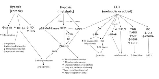 Some of the beneficial effects of therapeutic CO2 may be related to its ability to suppress inflammatory signaling and elevated ROS. Hypoxia, HIF-1α, and increased expression of glycolytic enzymes are linked to inflammation, and NF-κB can drive increased HIF-1α expression. Loss of oxygen supply, depletion of energy, and increased oxidative stress in ischemia/hypoxia result in the reduction of ATP synthesis and initiate a cascade of pathways that lead to cell death if not reversed. SIRT1 plays a major role in protecting against cellular stress and in controlling metabolic pathways during ischemia/hypoxia.