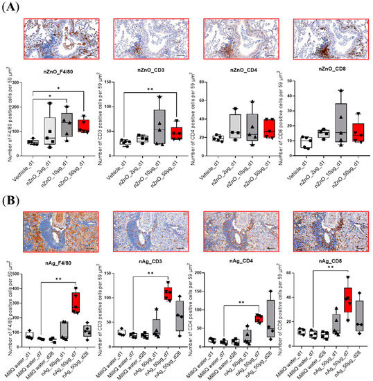 Immunohistochemical staining of mouse lungs exposed to nZnO and nAg for F4/80, CD3, CD4, and CD8. The number of the F4/80-, CD3-, CD4-, or CD8-positive cells per 59 μm2 are shown in (A) 1 day after exposure to 2, 10, or 50 µg of nZnO-, and (B) 1, 7, or 28 days after exposure to 50 µg of nAg. Immunohistochemical staining of one representative mouse lung is shown for nZnO 50 µg at day 1, and nAg 50 µg at day 7 (both bars indicated by red color). QuPath program was used for cell counting, and Mann–Whitney U-test was used for statistical analyses; * p < 0.05; ** p < 0.001 when compared to control groups. Scale bar: 100 µm.