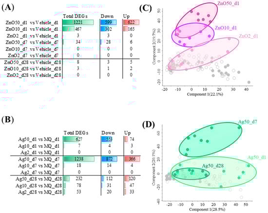 Exposure to nZnO and nAg causes varying numbers of differentially expressed genes (DEGs) in mouse lung tissue and induces changes in associated principal component analysis (PCA). The exposure to (A) nZnO or (B) nAg yielded a different number of total DEGs, which were either up- or down-regulated. When a fold change was ≥|1.25| and Benjamini-Hochberg adj. p-value was ≤0.05, DEGs were considered significantly different. The first two components are shown in (C) for nZnO and in (D) for nAg in PCAs. In (C), dark red filled circles represent 50 µg of nZnO, red 10 µg of nZnO, and light red 2 µg of nZnO 1 day after the exposure. In (D), dark green filled circles represent the exposure after 1 day, green represents the exposure after 7 days, and light red represents the exposure after 28 days to 50 µg of nAg.