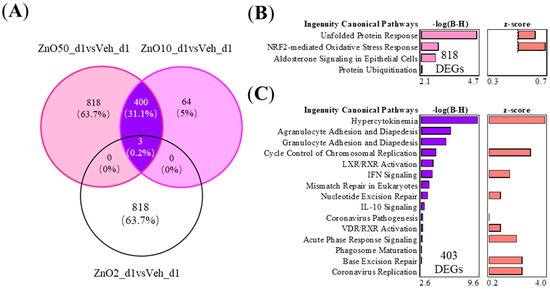 The nZnO-treated mouse lung tissues have specific or shared gene expressions with varying functions depending on the particle concentration 1 day after the exposure. (A) The exposure to nZnO yielded 403 shared and 818 or 64 specific DEGs in the VENN diagram for nZnO 50 µg or nZnO 10 µg, respectively. The different canonical pathways (IPA) are shown in (B) for 818 DEGs, which are exclusively expressed after exposure to 50 µg of nZnO, and in (C) for 403 DEGs after exposure to 10 or 50 µg of nZnO. The negative logarithm of the p-value calculated by the right-tailed Benjamini-Hochberg test is equal to increased significance. The predicted pathway activation (red bars) or inhibition are represented in the z-score bar chart.