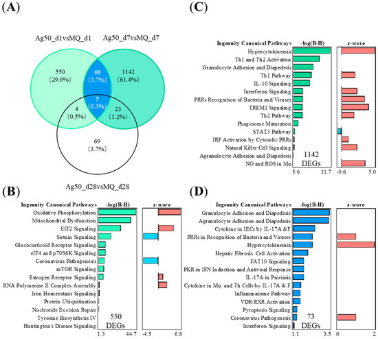 The nAg-treated mouse lung tissues have specific or shared gene expressions with varying functions depending on the time after the 50 µg of nAg exposure. (A) The exposure to nAg yielded 73 shared and 550 or 1142 specific DEGs in the VENN diagram for nAg 1 or 7 days after the exposure, respectively. NAg 28 days after the exposure yielded 101 DEGs. Five DEGs were shared between all the groups. The different canonical pathways (IPA) are shown in (B) for 550 DEGs exclusively expressed 7 days after the exposure, in (C) for 1142 DEGs exclusively 1 day after the exposure, and in (D) for the shared 73 DEGs 1 and 7 days after the exposure. The negative logarithm of the p-value calculated by the right-tailed Benjamini-Hochberg test is equal to increased significance. The predicted pathway activation (red) or inhibition (blue) are represented in the z-score bar chart.