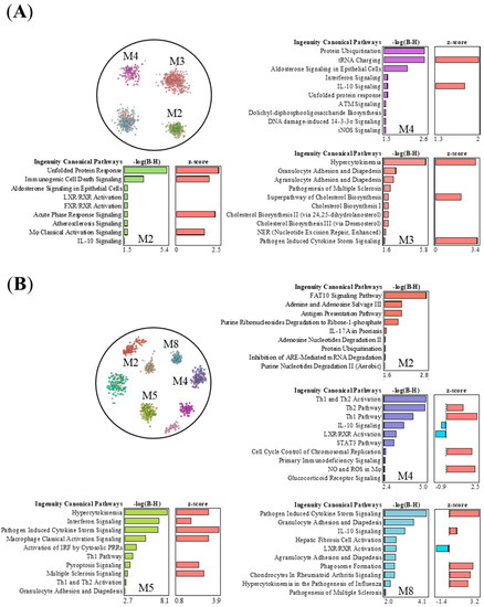 To study whether the most prominent effects triggered by nZnO and nAg show similarities or differences in the function of expression modules, we compared the top 700 DEGs of the 50 μg nZnO exposure group after 1 day and the 50 μg nAg exposure group after 7 days and performed gene network analysis, response module detection, and prediction of module function by canonical pathway analysis (IPA) (Figure 5). Four modules were detected in the group of 50 μg nZnO after 1 day (Figure 5A). Module 2 was related to endoplasmic reticulum stress and inflammatory responses such as immunogenic cell death and acute phase response (Figure 5A). Module 3 was enriched to cytokine storm and the migration of different types of leukocytes, while module 4 was enriched to ubiquitin modifications, amino acid activation, and cytokine signaling (Figure 5A). Exposure to 50 μg nAg after 7 days yielded eight modules (Figure 5B). Module 2 was related to ubiquitin modifications, cell metabolism, and antigen presentation, while module 4 was enriched to activation of Th1 and Th2 and the signaling of IL-10 (Figure 5B). Module 5 was related to cytokines, “interferon signaling”, and cytokine storm signaling induced by pathogens, classical activation of macrophages, and the activation of the innate immune response (Figure 5B). Additionally, module 8 was enriched to the signaling of cytokine storm induced by pathogens (Figure 5B).
