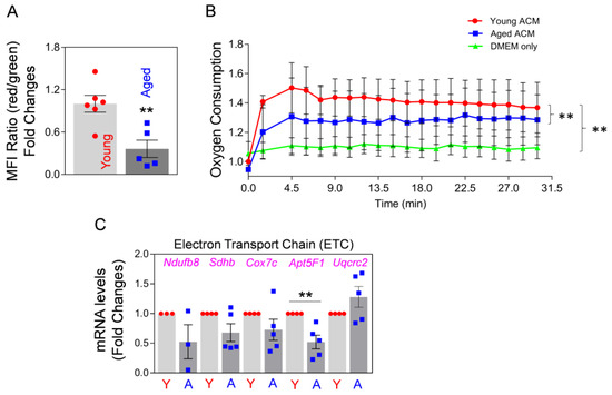There have been some reports showing that CCL11 reduction by experimental challenges in aged mice restored cognitive function [15,72,73]. Recently, we demonstrated that astrocytes release functional Mt which can be taken up by microglia and neurons, where they promote a “healing” phenotype in microglia and enhance the anti-oxidative capacity of neurons, contributing to improved functional recovery from brain injury [48,49]. Our earlier study also demonstrated that MitoTracker-labeled astrocytic Mt were abundantly seen in the soma and neurite of cultured primary neurons after their transfer for at least 7 days [49]. Emerging data also suggest that Mt transfer between cells in the brain is to assist the recipient cells in improved functioning, suggesting that the use of healthy functional Mt as a therapeutic approach for aged brain rejuvenation deserves further investigation [43,44,45,46,47,48,49]. Mitochondrial dysfunction is a hallmark of age-induced neurodegeneration [40,41,42,56]. However, the mechanism by which dysfunctional Mt in the brain influences the aging-mediated cognitive decline is not clear. Our present study showed that the functionality of Mt released from aged vs. young astrocytes is compromised. We found that the membrane potential, oxygen consumption rate, and mRNA levels of the electron transport chain (ETC) of aged astrocytes are impaired.