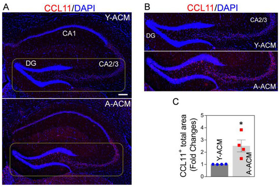 CCL11 is highly elevated in the hippocampal area of aged mice brains. (A) Representative immunofluorescence confocal images of CCL11 (green) staining in the hippocampus of young (3-month-old) vs. aged (22-month-old) mice brains. Images indicate higher level of CCL11 in the aged hippocampus compared to the young hippocampus. Nuclei were stained with DAPI (blue). Scale bar, 200 µm. (B) The illustrated graph shows a significant difference in CCL11- positive areas. N = 3–4 animals per group. The significance was assessed by a two-tailed unpaired t-test: * p < 0.05 (p = 0.0116, young vs. aged mice), t value (t = 3.881). All data are shown as mean ± SEM. Y, young; A, aged.