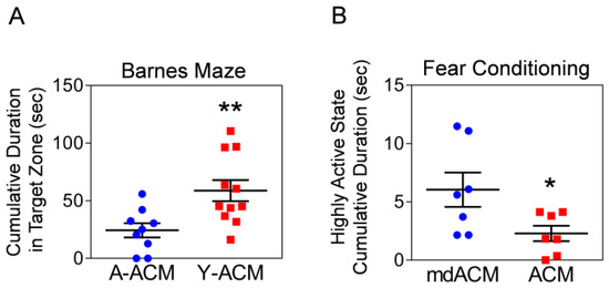 Next, we investigated if treatment of aged mice with young astrocytic Mt can also improve the cognitive deficit of these animals. Twenty-two-month-old mice once a week for 4 weeks intravenously received ACM containing Mt from cultures of astrocytes generated from either young (3-month-old) or aged (22-month-old) mice. At 4 weeks, the animals were tested for spatial learning and memory using Barnes maze. The mice receiving young astrocytic Mt showed significantly better performance (increased time spent in the target zone) compared to the mice receiving aged Mt (Figure 4A). In the subsequent experiment, 22-month-old mice were injected once a week for 4 weeks with ACM or Mt-depleted ACM (filtered to remove Mt) prior to being tested using the fear conditioning (associative learning) test. The mice receiving Mt showed a significant decrease in cumulative time of the highly active state (meaning increase in cumulative freezing time) in response to the cue (light), compared to the animals that received Mt-depleted fraction (mdACM) (Figure 4B). To investigate if this improvement in cognitive function in aged mice was due to improved hippocampal integrity, we measured the NeuN-positive neurons by using immunohistochemistry in the hippocampus of aged mice administered Y-ACM vs. A-ACM. We found the increases in NeuN-positive cells in the DG, CA1, and CA2/3 areas of the hippocampus in the aged mice that received Y-ACM compared to the mice that received A-ACM (Supplemental Figure S3). Our results suggest that systemic administration of young astrocytic Mt to aged animals reduces levels of hippocampal CCL11, while improving hippocampal integrity and cognitive functions.
