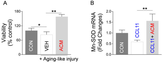 Astrocytic Mt enhance viability and antioxidant enzyme expression in hippocampal neurons under CCL11-induced aging-like environment in vitro. (A) Viability of hippocampal neurons under CCL11-induced aging-like injury (50 ng/mL CCL11 with 70 μΜ H2O2) with treatment of ACM. Viability was evaluated by lactate dehydrogenase (LDH) assay. Data represent mean ± SEM. The difference among groups was determined by one-way ANOVA with Tukey’s multiple comparisons (n = 4–7 per group). * p < 0.05 (p = 0.0263 control vs. aging-like injury), q value (q = 4.145); ** p < 0.01 (p < 0.001 vehicle vs. ACM in aging-like injury), q value (q = 15.82). (B) mRNA level (qRT-PCR) of Mn-SOD in hippocampal neurons treated with ACM or vehicle, followed by exposure to 50 ng/mL CCL11. Data represent mean ± SEM. The difference among groups was determined by one-way ANOVA with Tukey’s multiple comparisons (n = 5–6 per group). ** p < 0.01 (p = 0.0081 vehicle vs. ACM in CCL11 treatment), q value (q = 5.052).