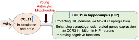We demonstrated here that systemic transfer of young astrocytic Mt into aged mice attenuates the level of CCL11 in the hippocampus as well as in the plasma of aged mice, and that these Mt improve the cognitive function of aged mice and enhance hippocampal integrity (Figure 7). This may be associated with a neuroprotective effect of Mt, as we also demonstrated that astrocytic Mt have neuroprotective capacity in ameliorating the CCL11-induced and oxidative stress-induced injury to hippocampal neurons, in vitro. Mt robustly prevented the reduction in Mn-SOD level caused by CCL11, which otherwise could result in defective defense from oxidative damage. An additional benefit of astrocytic Mt is that they can restore neuroplasticity inhibited by CCL11/CCR3, through upregulation of synaptogenesis-related gene expression and neurite outgrowth. Although this study proposes the CCL11/CCR3 axis as a major signaling pathway involved in the young astrocytic Mt-mediated cognition improvement in aged animals, other pathways may also in parallel contribute to this improvement. One possible mechanism is neuroprotective signaling mediated by the Mt-generated small peptide, humanin (HN). HN is an Mt-encoded small peptide and an Mt-secreted molecule with neuroprotective effects [48,49]. In our earlier studies, HN promoted the “reparative” phenotype of microglia by enhancing the peroxisome proliferator-activated receptor gamma (PPARγ) transcriptional pathway in the cultured microglia [48]. Also, HN enhanced anti-oxidative capacity and synaptic plasticity in the cultured neurons against intracerebral hemorrhagic-like injury [49]. These earlier studies suggest that HN is one of the key molecules in the astrocytic Mt-regulated neuroprotection. Others also demonstrated that the astrocyte-released HN prevented synaptic loss in the hippocampal neurons, suggesting that a reduction in HN with age may represent a possible mechanism for synaptic dysfunction and cognitive decline [74].