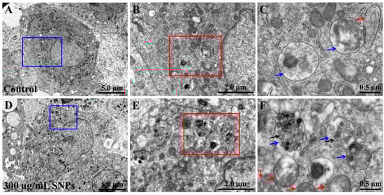 Cellular uptake of SNPs. (A) TEM image in the control group. (B) Blue area in (A). (C) Red area in (B). (D) TEM image in the SNP group. Primary cultured ovarian granulosa cells were exposed to 300 μg/mL SNPs for 24 h. (E) Blue area in (D). (F) Red area in (E). Black arrows indicate SNPs. Blue arrows indicate monolayer membranous vesicles containing lysosomes. Red arrows indicate bilayer membranous vesicles containing autophagosomes.