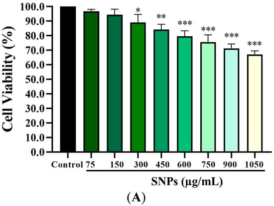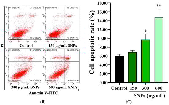 The CCK-8 assay results showed that lower concentrations (0–150 µg/mL) of SNPs had no significant impact on cell viability (Figure 2A), while the cell viability was significantly decreased at higher concentrations (300–1050 µg/mL, Figure 2A), indicating a dose-dependent cytotoxicity. In addition, the flow cytometry results showed that the apoptotic rate was significantly increased at (5.74 ± 0.50)%, (6.88 ± 0.40)%, (9.74 ± 1.25)%, and (14.69 ± 1.95)% after 0, 150, 300, and 600 µg/mL SNP exposures, respectively (Figure 2B,C).