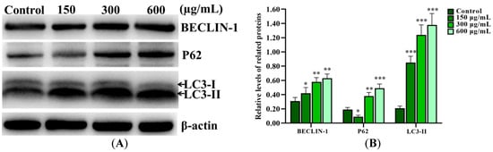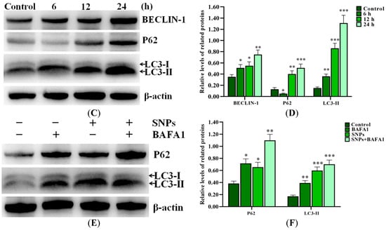 Western blot results showed that SNPs significantly increased BCL-2-interacting protein (BECLIN-1) and microtubule-associated protein light chain 3 II (LC3-II) levels in a dose-dependent manner and also increased the Sequestosome 1 (SQSTM1/P62) level after 300 and 600 µg/mL SNP exposures for 12 h, while they decreased the P62 level after 150 µg/mL SNP exposure compared to the control group (Figure 3A,B). In addition to an increase in the BECLIN-1 and LC3-II levels, SNPs also significantly increased the P62 level at 12 and 24 h, while it decreased at 6 h after 300 µg/mL SNP exposure (Figure 3C,D). Furthermore, SNPs, combined with Bafilomycin A1 (BAFA1), significantly increased the P62 and LC3-II levels compared to the SNP-only group (Figure 3E,F).