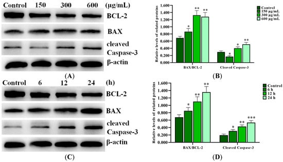 Western blot results showed that SNPs significantly increased the BAX/BCL-2 ratio and the cleaved caspase-3 level (Figure 4A,B). BCL-2, BAX, and cleaved caspase-3 levels were also investigated after 300 µg/mL SNP exposure at different times, respectively. Western blot results showed that SNPs significantly increased the BAX/BCL-2 ratio and the cleaved caspase-3 level in a time-dependent manner (Figure 4C,D).