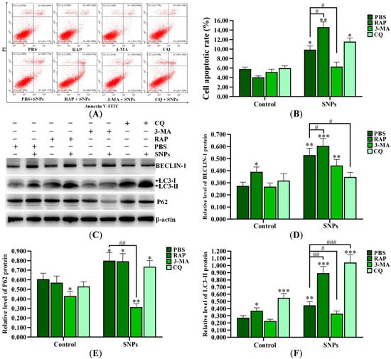 Inhibition of autophagy upon apoptosis induced by SNPs. (A) Cytotoxicity was determined by flow cytometry after 300 µg/mL SNP exposure, combined with 0.01 M PBS, 1 µM RAP, 0.2 µM 3-MA, and 5 µM CQ for 24 h. (B) Quantification of the apoptotic rate in (A). (C) Autophagy-related proteins were analyzed by Western blot. (D) Densitometric analysis of the BECLIN-1 level in (C). (E) Densitometric analysis of the P62 level in (C). (F) Densitometric analysis of the LC3-II level in (C). (G) The apoptotic proteins were analyzed by Western blot. (H) Densitometric analysis of the BAX/BCL-2 ratio in (G). (I) Densitometric analysis of cleaved caspase-3 level in (G). * p < 0.05, ** p < 0.01, and *** p < 0.001 vs. the control; # p < 0.05, ## p < 0.01, and ### p < 0.001 vs. SNP + PBS group.
