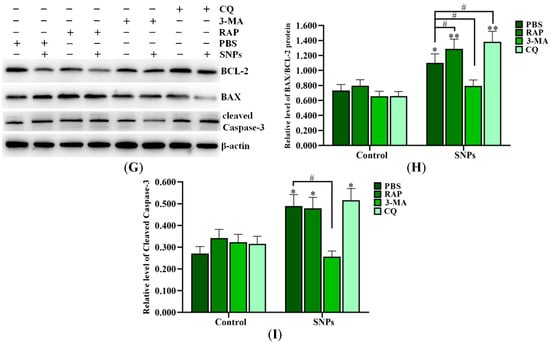 SNPs, combined with PBS (control group), 3-methyladenine (3-MA), chloroquine (CQ), and rapamycin (Rap), were exposed to ovarian granulosa cells. The flow cytometry results showed that the apoptotic rates in the SNP + RAP and SNP + CQ groups (14.62 ± 1.12)% and (11.57 ± 0.76)%, respectively, were increased, while they were significantly decreased in the SNP + 3-MA group (6.30 ± 0.95)%) compared to the SNP + PBS group (9.88 ± 0.80)%) after SNP exposure (Figure 5A,B). Meanwhile, Western blot results showed that SNPs, combined with RAP, significantly increased BECLIN-1 and LC3-II levels and had no significant difference in the P62 level compared to the SNP + PBS group. Combination with CQ significantly decreased the BECLIN-1 level, increased the LC3-II level, and had no significant difference on the P62 level compared to the SNP + PBS group. Combination with 3-MA had no significant difference on the BECLIN-1 level and decreased the LC3-II and P62 levels compared to the SNP + PBS group (Figure 5C–F). Furthermore, SNPs, combined with RAP or CQ, significantly increased the BAX/BCL-2 ratio, and had no significant difference on the cleaved caspase-3 level (Figure 5G,H), while combination with 3-MA significantly decreased the BAX/BCL-2 ratio and the cleaved caspase-3 levels compared to the SNP + PBS group (Figure 5G,I).