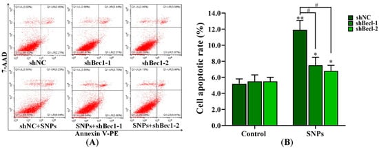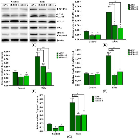 The flow cytometry results showed that, compared to the shNC + SNP group (11.87 ± 1.20)%), the apoptotic rates in the shBec1-1 + SNP and shBec1-2 + SNP groups (7.50 ± 0.96)% and (6.79 ± 0.68)%, respectively, were significantly decreased (Figure 6A,B). In addition, Western blot results showed that BECLIN-1, LC3-II, cleaved caspase-3 levels, and the BAX/BCL-2 ratio were significantly decreased in the shBec1-1 + SNP and shBec1-2 + SNP groups (Figure 6C–G).