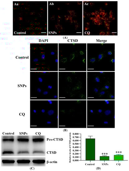 Lysosomal function after SNP exposure. (A) The acidity of lysosomes was qualitatively determined by fluorescence microscopy using LysoTracker Red dye after exposure to the control (Aa), 300 µg/mL SNPs (Ab), or 100 mM CQ (Ac) for 24 h. (B) The subcellular localization of CTSD was examined by fluorescence microscopy. (C) The level of CTSD in the lysosomes was analyzed by Western blot. (D) Densitometric analysis of mature CTSD level in C. *** p < 0.001 vs. the control.