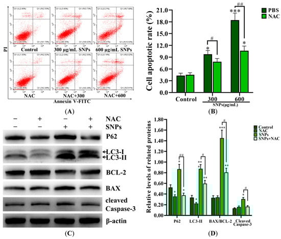 Effect of ROS on autophagy and apoptosis induced by SNPs. (A) Cytotoxicity was determined by flow cytometry after 300 and 600 µg/mL SNP exposures combined with 10 mM NAC for 24 h. (B) Quantification of the apoptotic rate in (A). (C) Autophagy-related and apoptotic proteins were analyzed by Western blot after 600 µg/mL SNP exposures, combined with 10 mM NAC for 12 h. (D) Densitometric analysis of the BAX/BCL-2 ratio, P62, LC3-II, and cleaved caspase-3 levels in (C). * p < 0.05, ** p < 0.01, and *** p < 0.001 vs. the control; # p < 0.05 and ## p < 0.01 vs. SNP + PBS group.