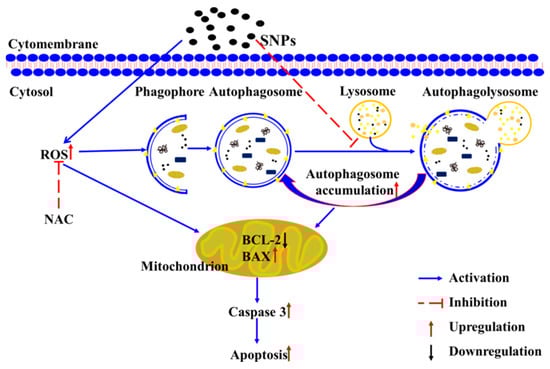 Excessive ROS production is widely accepted as one of the main toxic mechanisms caused by SNPs [,]. The excessive generation of ROS is reported to induce autophagy and eventually lead to cell apoptosis via the induction of oxidative stress []. Oxidative stress contributes to the deterioration in oocyte quality and a decline in fertility []. Liu et al. reported that oxidative stress cooperates in cell apoptosis in rat ovarian granulosa cells []. In addition, Siddique et al. found that oxidative stress causes cell apoptosis in ovarian granulosa and theca cells []. Recently, Jalouli et al. demonstrated that excessive ROS causes defective autophagy-related apoptosis in developing rat ovaries []. To determine the correlation between ROS generation and autophagy and apoptosis induced by SNPs, NAC, an antioxidant, was used to determine the potential role of ROS. Our results showed that NAC significantly decreased autophagy and apoptosis induced by SNPs via the detection of the BAX/BCL-2 ratio, cleaved caspase-3, and LC3-II levels (Figure 8). Collectively, these results suggest that SNPs activate autophagy and induce apoptosis via the production of excessive ROS. A diagram of the mechanisms involved in cytotoxicity induced by SNPs from the evidence we obtained is depicted in Figure 9.