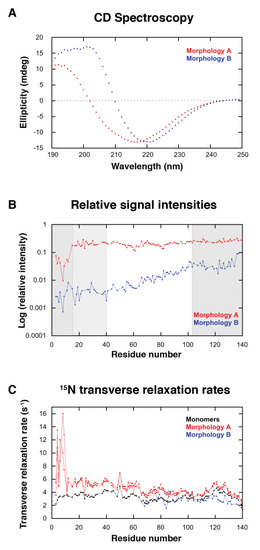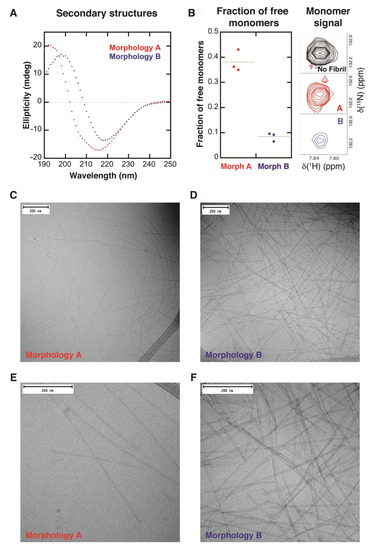 NMR was used to investigate the interaction of α-synuclein monomers with fibrils of morphologies A and B. The sequence dependence of the 15N−1H signal intensities of the soluble monomers was different in the presence of morphologies A and B, indicating that soluble monomers interact differently with the fibril surface of two different morphologies (Figure 3B).