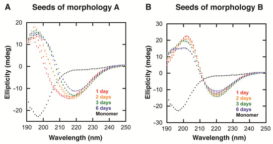 The replication of morphologies (A,B) using 1% seed. The different graphs show CD spectra of the monomeric sample (black), supplemented with 1% seeds of morphology (A) or 1% seeds of morphology (B) before incubation at 37 °C with stirring for 6 days. The CD spectra were measured after 1 day (red), 2 days (orange), 3 days (green), and 6 days (blue). Apart from the monomer, two replicates are shown for each time point.