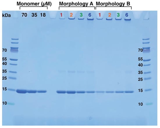 The bands appearing around 30 kDa correspond to dimers as centrifugation does not successfully separate monomers from dimers. The intensity of the band at 30 kDa is largely proportional to the band at 15 kDa, and thus more visible at the higher monomer concentrations in the presence of morphology A. The oligomeric distribution in the presence of morphologies A and B may be further investigated by methods, such as photo-induced cross-linking of unmodified proteins (PICUP).