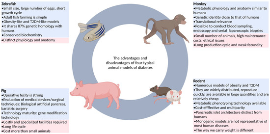 | Large mammals | Pig | The feeding cost is low and wide application is possible. The gene modification technology is relatively mature, and a variety of disease models can be generated through targeted gene editing. | It does not usually lead to diabetes and requires a combination of other means. It also requires special equipment and costs more than small animals. | [13,27,28] |