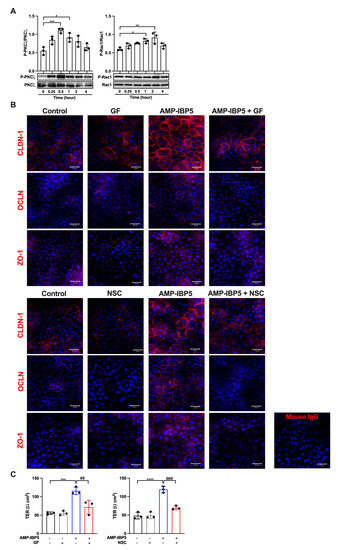 The two isoforms of the aPKC, namely, aPKCζ and aPKCi/λ, have been indicated to be associated with TJ barrier function [33,34]. Furthermore, activation of guanosine triphosphate (GTP)-bound Rac1 (GTP-Rac1) is fundamental for the formation of the TJ barrier and the maturation of epidermal keratinocytes [35]. Additionally, GTP-Rac1 activation is essential for the activation of aPKCζ [36]. Thus, we investigated whether AMP-IBP5 regulates TJ barrier function through activation of aPKC and GTP-Rac1. Treatment of human keratinocytes with AMP-IBP5 markedly increased the phosphorylation of aPKCζ, which peaked at 30 min. Phosphorylation of Rac1 (at Ser71) was observed 1 and 2 h post-stimulation (Figure 2A). Activation of both aPKC and Rac1 was necessary for AMP-IBP5-mediated regulation of the TJ barrier, as demonstrated by the inhibitory effects of GF 109203X, a pan-PKC inhibitor [37], and NSC23766, a specific inhibitor of Rac1 [38]. Indeed, the presence of GF 109203X notably suppressed the protein expression of claudin-1, occludin, and ZO-1 (Figure S2A) and impeded the intercellular localization of these TJ-related proteins (Figure 2B, upper panels). Moreover, treatment of keratinocyte monolayers with GF 109203X significantly suppressed the AMP-IBP5-induced increase in the TER (Figure 2C, left panel). Similarly, NSC23766 noticeably suppressed the expression of claudin-1, occludin, and ZO-1 (Figure S2B), impeded their intercellular localization (Figure 2B, lower panels), and decreased the TER (Figure 2C, right panel) in AMP-IBP5-treated keratinocytes. These observations suggest that activation of aPKCζ and Rac1 is needed for the AMP-IBP5-induced enhancement of TJ barrier function.