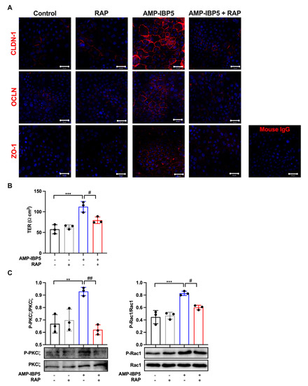 AMP-IBP5 was reported to induce the proliferation and migration of keratinocytes and fibroblasts through LRP1 [19]; thus, we hypothesized that AMP-IBP5 might regulate TJ barrier function through LRP1. To confirm our hypothesis, we pretreated keratinocytes with LDL receptor-related protein-associated protein 1 (LRPAP), also named RAP, an antagonist of LRP1 [39]. The presence of RAP significantly impeded the intercellular localization of the TJ-related proteins claudin-1, occludin, and ZO-1 (Figure 3A), and decreased the protein expression of these TJ-related proteins (Figure S3). Additionally, pretreatment of keratinocyte monolayers with RAP suppressed the AMP-IBP5-induced increase in the TER (Figure 3B) and the phosphorylation of aPKCζ and Rac1 (Figure 3C). These findings suggest that AMP-IBP5 regulates TJ barrier function through LRP1 and that aPKCζ and Rac1 function downstream of this receptor.