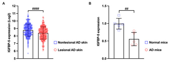 The expression of IGFBP-5 was decreased in lesional skin of patients with AD and in the AD mouse model. (A) The microarray datasets GSE27887, GSE32924, GSE36842, GSE58558, GSE59294, GSE95759, GSE99802, GSE107361, GSE120899, GSE130588, GSE133385, GSE133477, and GSE140684 were obtained from the Gene Expression Omnibus database. The samples included lesional skin (n = 413) and non-lesional skin (n = 344) of patients with AD. The data were analyzed with Transcriptome Analysis Console software 4.0 (Applied Biosystems, Thermo Fisher Scientific, Waltham, MA, USA). (B) The mRNA level of IGFBP-5 in AD mice was measured by real-time PCR. ## p < 0.01, #### p < 0.0001.