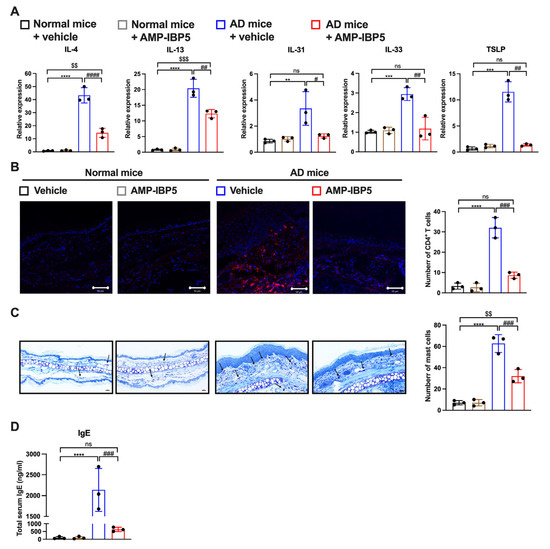 Interestingly, while the expression levels of type 2 cytokines IL-4, IL-13, and IL-33 and pruritic cytokines, such as IL-31 and thymic stromal lymphopoietin (TSLP), were increased in AD skin lesions, administration of AMP-IBP5 decreased the expression of type 2 and pruritic cytokines (Figure 7A). Injection of AMP-IBP5 into the skin lesions of AD mice also noticeably reduced the numbers of CD4+ T cells (Figure 7B) and mast cells (Figure 7C) and the total serum immunoglobulin (Ig) E level (Figure 7D).