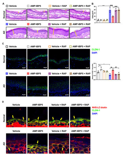 To confirm whether the AMP-IBP5-mediated enhancement of TJ protein expression is associated with a functional TJ barrier in AD mice, we performed a TJ permeability assay using an NHS-LC-biotin tracer, as described previously [41]. In normal mice with a functional TJ barrier, the tracer does not pass through the outermost layer of the epidermis, whereas in mice with a disrupted TJ barrier the tracer does so readily [8,42]. As shown in Figure 6E, the penetration of the tracer (red) into the epidermis of normal mice was blocked (arrowheads) by the functional TJ barrier, which is represented by claudin-1 (green dots). However, in AD mice, the tracer was able to pass through the epidermis. As expected, after AMP-IBP5 treatment, tracer penetration was again blocked by the TJ barrier, indicating that AMP-IBP5 treatment restored TJ barrier function in AD mice.