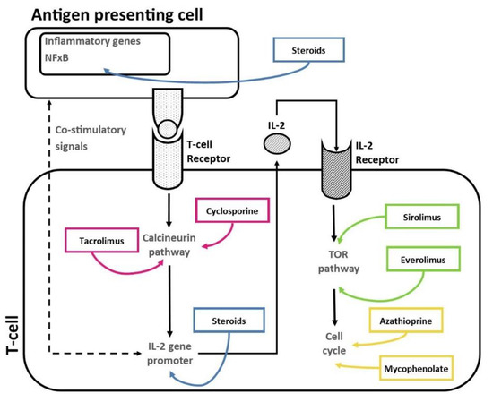 The immunosuppressive drugs used to prevent graft rejection during maintenance therapy inhibit the activity/proliferation of circulating T cells via different mechanisms of action (Figure 1).