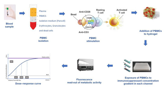 Using a standard Ficoll™ gradient procedure, peripheral blood mononuclear cells (PBMCs) are isolated from the patient’s blood sample. PBMCs are then activated via incubation for 4 days in a standard incubator (37 °C, 5% CO2) in X-VIVO medium in the presence of agonistic antibodies (Dynabeads Human T-activator CD3/CD28) to induce their activation and proliferation. Activated PBMCs are embedded in a hydrogel substrate, which is added to segregated channels in the IMBG plate. Currently, the IMBG plate is designed to simultaneously test two control conditions (a positive control [C+], consisting of stimulated PBMCs, and a blank control, lacking PBMCs) and the following five immunosuppressant conditions: mycophenolic acid, tacrolimus, methyl prednisolone, sirolimus, and everolimus. Autoclaved paper discs used to deliver immunosuppressant drugs are placed at the end of the hydrogel+PBMC-loaded channels in the IMBG plate. No discs are placed in either of the two control channels (positive and blank controls). The passive diffusion of the immunosuppressant through the hydrogel generates a concentration gradient along which the activation/proliferation of the embedded PBMCs is inhibited in a dose-dependent manner. After placement of the discs loaded with the immunosuppressants of interest, the IMBG plate is incubated for approximately 15 h at 37 °C and 5% CO2. PBMC metabolic activity, which reflects activation and proliferation, is determined using a resazurin-based assay followed by measurement of PBMC fluorescence using a microplate reader [15] (Figure 3).